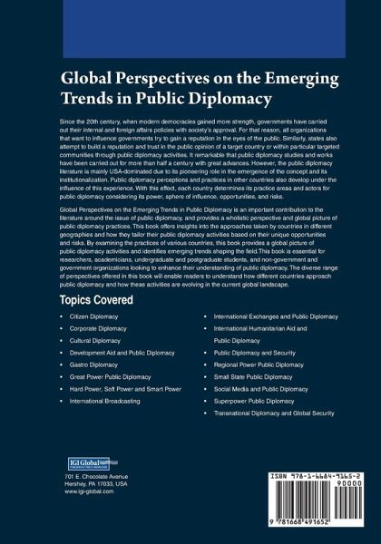 Since the 20th century, when modern democracies gained more strength, governments have carried out their internal and foreign affairs policies with society's approval. For that reason, all organizations that want to influence governments try to gain a reputation in the eyes of the public. Similarly, states also attempt to build a reputation and trust in the public opinion of a target country or within particular target communities through public diplomacy activities. It is seen that remarkable public diplomacy studies and works have been carried out for more than half a century, and the field has advanced. However, the public diplomacy literature is mainly USA-dominated due to its pioneering role in the emergence of the concept and its institutionalization. Public diplomacy perceptions and practices in other countries also develop under the influence of this experience. With this effect, each country determines its practice areas and actors for public diplomacy considering its power, sphere of influence, opportunities, and risks. Global Perspectives on the Emerging Trends in Public Diplomacy offers insights into the approaches taken by countries in different geographies and how they tailor their public diplomacy activities based on their unique opportunities and risks. By examining the practices of various countries, this book provides a global picture of public diplomacy activities and identifies emerging trends shaping the field. This book is essential for researchers, academicians, undergraduate and postgraduate students, and non-government and government organizations looking to enhance their understanding of public diplomacy. The diverse range of perspectives offered in this book will enable readers to understand how different countries approach public diplomacy and how these activities are evolving in the current global landscape.