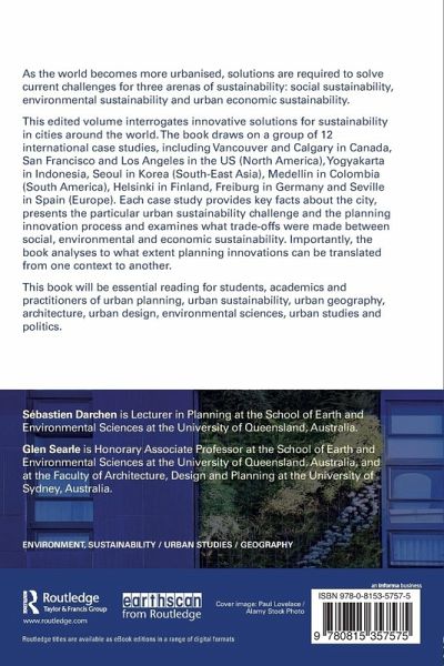 As the world becomes more urbanised, solutions are required to solve current challenges for three arenas of sustainability: social sustainability, environmental sustainability and urban economic sustainability. This edited volume interrogates innovative solutions for sustainability in cities around the world. The book draws on a group of 12 international case studies, including Vancouver and Calgary in Canada, San Francisco and Los Angeles in the US (North America), Yogyakarta in Indonesia, Seoul in Korea (South-East Asia), Medellin in Colombia (South America), Helsinki in Finland, Freiburg in Germany and Seville in Spain (Europe). Each case study provides key facts about the city, presents the particular urban sustainability challenge and the planning innovation process and examines what trade-offs were made between social, environmental and economic sustainability. Importantly, the book analyses to what extent these planning innovations can be translated from one context to another. This book will be essential reading to students, academics and practitioners of urban planning, urban sustainability, urban geography, architecture, urban design, environmental sciences, urban studies and politics.