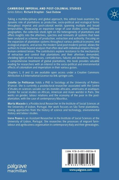Foreword: Cristiana Bastos.- 1. Introduction: Viewing plantations at the intersection of political ecologies and multiple space-times Irene Peano, Marta Macedo and Colette Le Petitcorps.- Part I. Revisiting the Caribbean: Genealogies for the Plantationocene.- 2. From Marrons to Kreyòl: Human-Animal Relations in early Caribbean Rodrigo C. Bulamah.- 3. The rise and fall of caporalisme agraire in Haiti (1789-1806): Labour perspectives through the plantation complex Martino Sacchi and Lorenzo Ravano.- 4. Cacos and Cotton: Unmaking Imperial Geographies on Haiti's Central Plateau Sophie Sapp Moore.- 5. Revolutionary sovereignty as lost normality: Nostalgia for oranges in a former Plantation in Cuba Marie Aureille.- Part II. Continental and Pacific Americas: Multiple subjectivities between control and resistance.- 6. '[A] continual exercise of...Patience and Economy': Plantation overseers, agricultural innovation and state formation in eighteenth-century North America Tristan Stubbs.- 7. Inside the Big House: Slavery, Rationalization of Domestic Labor and the Construction of a New Habitus on Brazilian Coffee Plantations during the Second Slavery Mariana Muaze.- 8. Plantation Colonialism in Late Nineteenth-Century Hawai'i: The Case of Chinese Sugar Planters Nicholas B. Miller.- Part III. West Africa and its diasporas: Excavating forgotten pasts and haunted presents.- 9. The materialities of Danish plantation agriculture at Dodowa, Ghana: An archaeological perspective David Abrampah.- 10. "Sweet Mother": The Neoliberal Plantation in Sierra Leone Nile Davies.- 11. "New Slavery", modern marronage and the multiple afterlives of plantations in contemporary Italy Irene Peano.- Part IV. South and South-East Asia: Indigenous labour, more-than-human entanglements and the afterlives of multiple crises.- 12. Themultispecies World of Oil Palm: Indigenous Marind Perspectives on Plantation Ecologies in West Papua Sophie Chao.- 13. Colonial plantations and their afterlives: Legal disciplines, Indian historiographies and their lessons. An interview with Rana Behal Marta Macedo, Irene Peano, Colette Le Petitcorps.- Afterword.- 14. Afterlives: The Recursive Plantation Deborah A. Thomas