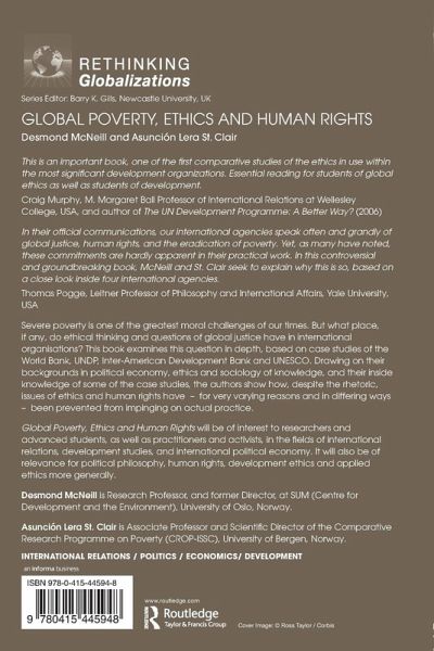 Severe poverty is one of the greatest moral challenges of our times. But what place, if any, do ethical thinking and questions of global justice have in the policies and practice of international organizations? This books examines this question in depth, based on an analysis of the two major multilateral development organizations - the World Bank and the UNDP - and two specific initiatives where poverty and ethics or human rights have been explicitly in focus: in the Inter-American Development Bank and UNESCO. The current development aid framework may be seen as seeking to make globalization work for the poor; and multilateral organizations such as these are powerful global actors, whether by virtue of their financial resources, or in their role as global norm-setting bodies and as sources of hegemonic knowledge about poverty. Drawing on their backgrounds in political economy, ethics and sociology of knowledge, as well as their inside knowledge of some of the case studies, the authors show how, despite the rhetoric, issues of ethics and human rights have - for very varying reasons and in differing ways - been effectively prevented from impinging on actual practice. Global Poverty, Ethics and Human Rights will be of interest to researchers and advanced students, as well as practitioners and activists, in the fields of international relations, development studies, and international political economy. It will also be of relevance for political philosophy, human rights, development ethics and applied ethics more generally.