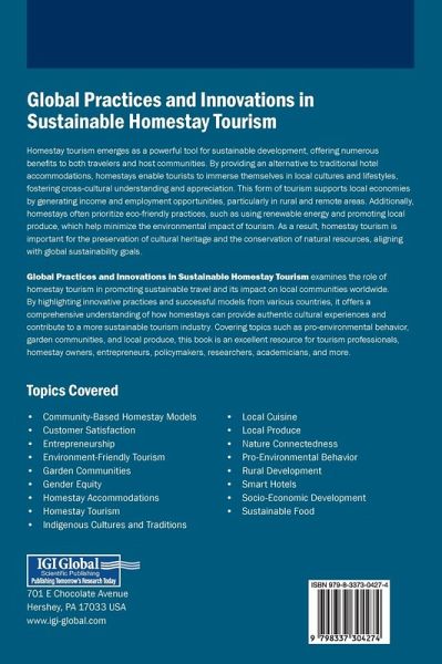 Homestay tourism emerges as a powerful tool for sustainable development, offering numerous benefits to both travelers and host communities. By providing an alternative to traditional hotel accommodations, homestays enable tourists to immerse themselves in local cultures and lifestyles, fostering cross-cultural understanding and appreciation. This form of tourism supports local economies by generating income and employment opportunities, particularly in rural and remote areas. Additionally, homestays often prioritize eco-friendly practices, such as using renewable energy and promoting local produce, which help minimize the environmental impact of tourism. As a result, homestay tourism is important for the preservation of cultural heritage and the conservation of natural resources, aligning with global sustainability goals. Global Practices and Innovations in Sustainable Homestay Tourism examines the role of homestay tourism in promoting sustainable travel and its impact on local communities worldwide. By highlighting innovative practices and successful models from various countries, it offers a comprehensive understanding of how homestays can provide authentic cultural experiences and contribute to a more sustainable tourism industry. Covering topics such as pro-environmental behavior, garden communities, and local produce, this book is an excellent resource for tourism professionals, homestay owners, entrepreneurs, policymakers, researchers, academicians, and more.