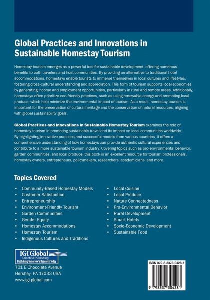 Homestay tourism emerges as a powerful tool for sustainable development, offering numerous benefits to both travelers and host communities. By providing an alternative to traditional hotel accommodations, homestays enable tourists to immerse themselves in local cultures and lifestyles, fostering cross-cultural understanding and appreciation. This form of tourism supports local economies by generating income and employment opportunities, particularly in rural and remote areas. Additionally, homestays often prioritize eco-friendly practices, such as using renewable energy and promoting local produce, which help minimize the environmental impact of tourism. As a result, homestay tourism is important for the preservation of cultural heritage and the conservation of natural resources, aligning with global sustainability goals. Global Practices and Innovations in Sustainable Homestay Tourism examines the role of homestay tourism in promoting sustainable travel and its impact on local communities worldwide. By highlighting innovative practices and successful models from various countries, it offers a comprehensive understanding of how homestays can provide authentic cultural experiences and contribute to a more sustainable tourism industry. Covering topics such as pro-environmental behavior, garden communities, and local produce, this book is an excellent resource for tourism professionals, homestay owners, entrepreneurs, policymakers, researchers, academicians, and more.
