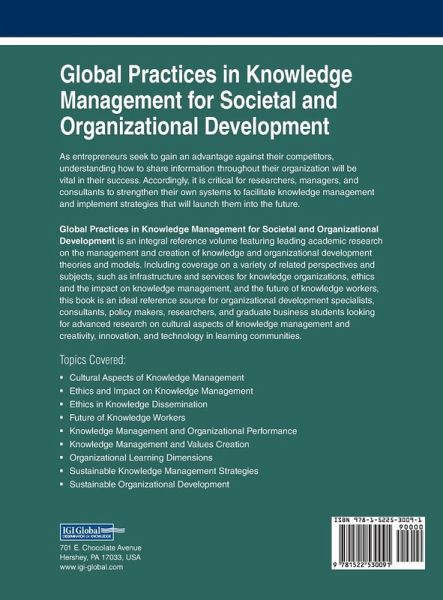 As entrepreneurs seek to gain an advantage against their competitors, understanding how to share information throughout their organization will be vital in their success. Accordingly, it is critical for researchers, managers, and consultants to strengthen their own systems to facilitate knowledge management and implement strategies that will launch them into the future. Global Practices in Knowledge Management for Societal and Organizational Development is an integral reference volume featuring leading academic research on the management and creation of knowledge and organizational development theories and models. Including coverage on a variety of related perspectives and subjects, such as infrastructure and services for knowledge organizations, ethics and the impact on knowledge management, and the future of knowledge workers, this book is an ideal reference source for organizational development specialists, consultants, policy makers, researchers, and graduate business students looking for advanced research on cultural aspects of knowledge management and creativity, innovation, and technology in learning communities.