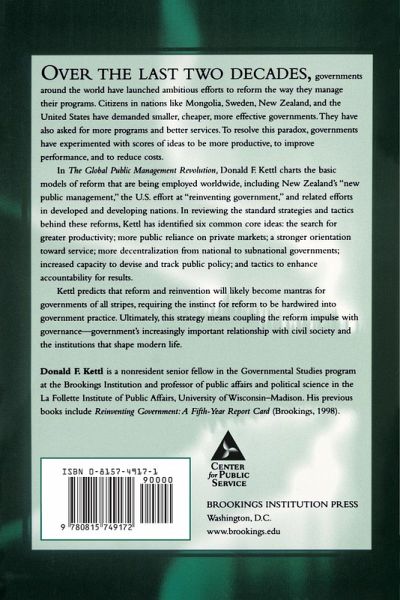 " Over the last two decades, governments around the world have launched ambitious efforts to reform the way they manage their programs. Citizens in nations like Mongolia and Sweden, New Zealand, and the United States have demanded smaller, cheaper, more effective governments. They have also asked for more programs and better services. To resolve this paradox, governments have experimented with scores of ideas to be more productive, to improve performance, and to reduce costs. In The Global Public Management Revolution, Donald F. Kettl charts the basic models of reform that are being employed worldwide, including New Zealand's ""new public management,"" the U.S. effort at ""reinventing government,"" and related efforts in developed and developing nations. In reviewing the standard strategies and tactics behind these reforms, Kettl has identified six common core ideas: the search for greater productivity; more public reliance on private markets; a stronger orientation toward service; more decentralization from national to subnational governments; increased capacity to devise and track public policy; and tactics to enhance accountability for results. Kettl predicts that reform and reinvention will likely become mantras for governments of all stripes, requiring the instinct for reform to be hardwired into government practice. Ultimately, this strategy means coupling the reform impulse with governance-government's increasingly important relationship with civil society and the institutions that shape modern life."