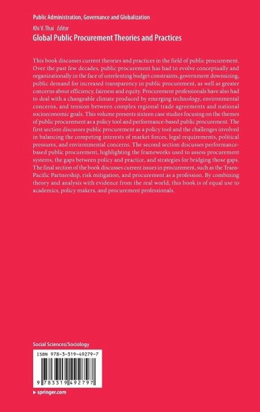 1. Global Public Procurement: Introduction.- Part I. Procurement Preferences.- 2. Public Procurement in Lithuania: (Dis)Balance between Profitability and Environmental Protection.- 3. Analyzing Local and SME Participation in Public Procurement: Evidence from Seven Cities.- 4. The Social Value in Social Clauses: Methods of Measuring and Evaluation in Social Procurement.- Part II. Performance-based Public Procurement.- 5. A Price Review Framework for Maintenance, Repair and Operations: Procurement Contracts in the Public Sector.- 6. Contractual Governance Mechanisms, Dynamic Capabilities, Transactional Specific Relationships and Supplier Performance in Uganda.- 7. Explaining the Policy-Practice Gap in U.S. Federal Contracting: Institutional Isopraxism and Performance-Based Acquisition.- 8. Quality of Local Environment and Efficiency in Public Works Execution.- 9. Strengthening the Effectiveness of Exclusion Mechanism in Public Procurement.- 10. Promoting Public Procurement of Sustainable Innovations: Approaches for Effective Market Dialogue.- 11. Small Public Procurement Contracts.- 12. The Effect of a Government Target for the Procurement of Innovation: The Case of the UK's Small Business Research.- 13. Public Procurement in TTIP: An Opportunity to Set Global Standards.- PART III. Other Public Procurement Issues.- 14. Asymmetric Information and Integrity Pacts for Public Procurement: A Case Study.- 15. Managing the Risks of Outsourcing a Health Service Function.- 16. Best Practice in South African Construction Procurement Law.- 17. The What, Who, and How of Public Procurement: Job Functions Performed and Managed by Professionals.