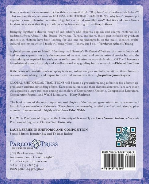 GLOBAL RHETORICAL TRADITIONS is unique in design and scope. It presents translated primary sources on global rhetorical instruction and practices of Asia, Africa, the Near East, the Middle East, Polynesia, and precolonial Europe. Each chapter represents a different rhetorical region and includes an introduction, critical commentary, translated primary sources, a glossary of rhetorical terms, and a comprehensive bibliography. The general introduction helps contextualize the project, justify its organization and coverage, and draw attention to the various features, characteristics, and/or philosophies of the rhetorics included. The book's significance lies in its contributions to studying and teaching global rhetorical traditions by offering representative research methods and primary sources in a single volume. It can be read as scholarship, as reference, and as textbook. ¿¿¿¿¿¿¿"When a reviewer sees a manuscript like this, she should think, "Why hasn't anyone done this before?" That was exactly my response to Global Rhetorical Traditions: Why hasn't anyone put together a comprehensive collection of global rhetorical contributions? Hui Wu and Tarez Samra Graban make clear that they are whom we've been waiting for." -Cheryl Glenn "Bringing together a diverse range of sub-editors who expertly explain and analyze rhetorics and traditions from Africa, India, Russia, Polynesia, Turkey, and more, this is just the book my graduate students in rhetoric have been looking for and one my undergrads, in the multi-identity, multi-cultural context in which I teach will simply love. I know, cuz I do." -Vershawn Ashanti Young "A global counterpart to Bizzell, Herzberg, and Reames's The Rhetorical Tradition, this meticulously edited volume expands not only the spectrum of transnational and comparative rhetorics but also the methodologies required for analyses. A stellar contribution to our scholarship, GRT will become a foundational source for study and a well-charted map guiding future research." -Richard Leo Enos "With the use of translations of exemplary texts and robust analyses and interpretations, this volume re-casts our sense of origin and impact in rhetorical arenas over time." -Jacqueline Jones Royster ". . . a groundbreaking reference for a better appreciation and understanding of non-European cultures and their rhetorical nature. I am sure that it will appeal to a large audience among all scholars of Comparative Rhetoric, Comparative Literature, Comparative Poetics, and World Literature." -Hany Rashwan The book is one of the most important anthologies of the last two generations and is a must-read for scholars and teachers of rhetoric. The volume is trustworthy, carefully crafted, and, simply, phenomenal. I recommend it highly.-Kathleen Ethel Welch Wide-ranging in scope, innovative in methodology, and significant in its contribution, Global Rhetorical Traditions teaches us what it means to engage with global rhetorical traditions in the twenty-first century.-LuMing Mao Hui Wu is Professor of English and Chair of the Department of Literature and Languages at the University of Texas at Tyler. Tarez Samra Graban is Associate Professor of English at Florida State University. Contributors: Raed Alsawaier, Leonora Anyango, Maha Baddar, Shuv Raj Rana Bhat, Gregory Coles, Trey Conner, Rasha Diab, Richard Doyle, Robert Eddy, Lahcen Ezzaher, Tarez Samra Graban, Shreelina Ghosh, Elif Guler, ku'ualoha ¿ho'omanawanui, Steven B. Katz, Andrew Kirkpatrick, Uma Krishnan, Haixia Lan, Keith Lloyd, Anne Melfi, Georganne Nordstrom, Lana Oweidat, Maria Prikhodko, Ellen Quandahl, Jim Ridolfo, Brian J. Stone, Jeffrey Walker, and Hui Wu.
