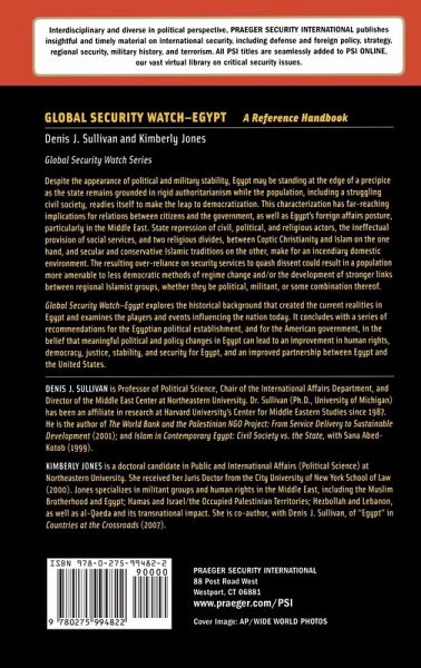 Despite the appearance of political and military stability, Egypt may be standing at the edge of a precipice as the state remains grounded in rigid authoritarianism while the population, including a struggling civil society, readies itself to make the leap to democratization. This characterization has far-reaching implications for relations between citizens and the government, as well as Egypt's foreign affairs posture, particularly in the Middle East. State repression of civil, political, and religious actors; the ineffectual provision of social services; and two religious divides, between Coptic Christianity and Islam on the one hand, and secular and conservative Islamic traditions on the other, make for an incendiary domestic environment. The resulting over-reliance on security services to quash dissent could result in a population more amenable to less democratic methods of regime change and/or the development of stronger linkages between regional Islamist groups, whether they be political, militant, or some combination thereof. Global Security Watch-Egypt explores the historical background that created the current realities in Egypt and examines the players and events influencing the nation today. It concludes with a series of recommendations for the Egyptian political establishment, and for the American government, in the belief that meaningful political and policy changes in Egypt can lead to an improvement in human rights, democracy, justice, stability, and security for Egypt, and an improved partnership between Egypt and the United States.