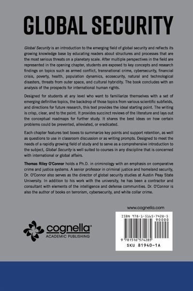 Global Security is an introduction to the emerging field of global security and reflects its growing knowledge base by educating readers about structures and processes that are the most serious threats on a planetary scale. After multiple perspectives in the field are represented in the opening chapter, students are exposed to key concepts and research findings on topics such as armed conflict, transnational crime, cybersecurity, financial crisis, poverty, health, population dynamics, ecosecurity, natural and technological disasters, threats from outer space, and cultural hybridity. The book concludes with an analysis of the prospects for international human rights. Designed for students at any level who want to familiarize themselves with a set of emerging definitive topics, the backdrop of those topics from various scientific subfields, and directions for future research, this text provides the ideal starting point. The writing is crisp, clear, and to the point. It provides succinct reviews of the literature and lays out the conceptual roadmaps for further study. It shares the best ideas on how certain problems could be prevented, alleviated, or eradicated. Each chapter features text boxes to summarize key points and support retention, as well as questions to use in classroom discussion or as writing prompts. Designed to meet the needs of a rapidly growing field of study and to serve as a comprehensive introduction to the subject, Global Security is well suited to courses in any discipline that is concerned with international or global affairs. Thomas Riley O'Connor holds a Ph.D. in criminology with an emphasis on comparative crime and justice systems. A senior professor in criminal justice and homeland security, Dr. O'Connor also serves as the director of global security studies at Austin Peay State University. In addition to his work with the university, he has been a contractor and consultant with elements of the intelligence and defense communities. Dr. O'Connor is also the author of books on terrorism, cybersecurity, and white collar crime.