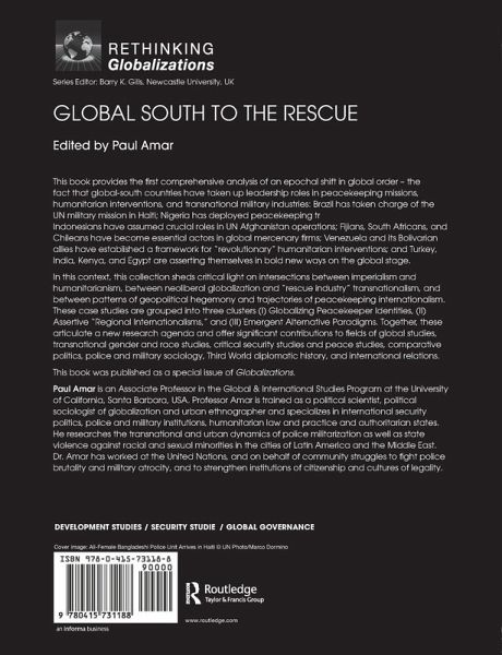 This book provides the first comprehensive analysis of an epochal shift in global order - the fact that global-south countries have taken up leadership roles in peacekeeping missions, humanitarian interventions, and transnational military industries: Brazil has taken charge of the UN military mission in Haiti; Nigeria has deployed peacekeeping troops throughout West Africa; Indonesians have assumed crucial roles in UN Afghanistan operations; Fijians, South Africans, and Chileans have became essential actors in global mercenary firms; Venezuela and its Bolivarian allies have established a framework for "revolutionary" humanitarian interventions; and Turkey, India, Kenya, and Egypt are asserting themselves in bold new ways on the global stage. In this context, this collection sheds critical light on intersections between imperialism and humanitarianism, between neoliberal globalization and "rescue industry" transnationalism, and between patterns of geopolitical hegemony and trajectories of peacekeeping internationalism. These case studies are grouped into three clusters (I) Globalizing Peacekeeper Identities, (II) Assertive "Regional Internationalisms," and (III) Emergent Alternative Paradigms. Together, these articulate a new research agenda and offer significant contributions to fields of global studies, transnational gender and race studies, critical security studies and peace studies, comparative politics, police and military sociology, Third World diplomatic history, and international relations. This book was published as a special issue of Globalizations.