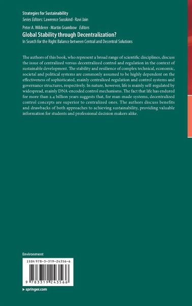 The authors of this book, who represent a broad range of scientific disciplines, discuss the issue of centralized versus decentralized control and regulation in the context of sustainable development. The stability and resilience of complex technical, economic, societal and political systems are commonly assumed to be highly dependent on the effectiveness of sophisticated, mainly centralized regulation and control systems and governance structures, respectively. In nature, however, life is mainly self-regulated by widespread, mainly DNA-encoded control mechanisms. The fact that life has endured for more than 2.4 billion years suggests that, for man-made systems, decentralized control concepts are superior to centralized ones. The authors discuss benefits and drawbacks of both approaches to achieving sustainability, providing valuable information for students and professional decision makers alike.