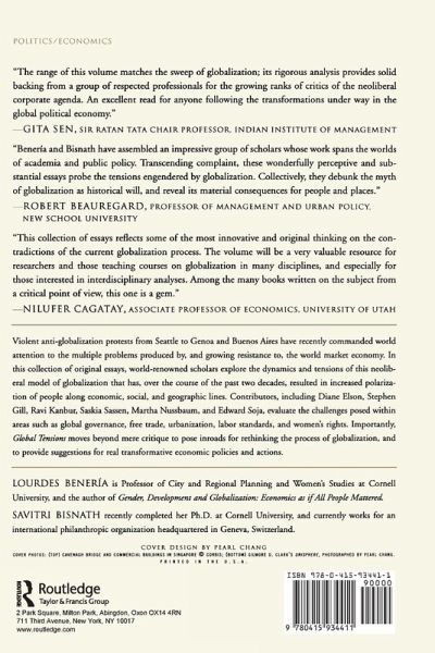 Introduction - Lourdes Beneria and Savitri Bisnath Section I: Globalization and Global Governance 1. Towards a stark utopia? New constitutionalism and the politics of globalization, Stephen Gill 2. Tax Distortion in the Global Economy, Howard Wachtel 3. Human Rights and Corporate Profits: the UN Global Compact - Part of the Solution or Part of the Problem?, Diane Elson 4. Cross-Border Externalities and International Public Goods: Implications for Aid Agencies, Ravi Kanbur Section II: North-South Tensions 5. Financial Sector Liberalization and the Asian Financial Crisis: The IFIs Got it Wrong Twice, Iwan J. Azis 6. Developing Countries and the New Financial Architecture, Stephanie Griffith-Jones 7. Globalization: Eight Crises of Social Protection, Guy Standing Section III: The Politics of International Trade 8. Biotechnology and Food Security: Profiting on Insecurity?, Philip McMichael 9. The WTO, GATS and TPRM: Servicing Liberalization and Eroding Equity Goals?, Savitri Bisnath 10. Labour Standards, Women's Rights, Basic Needs: Challenges to Collective Action in a Globalizing World, Naila Kabeer 11. Contesting Global Trade Rules: Social Movements and the World Trade Organization, Marc Williams Section IV: Gender, Globalization and Development 12. Utilizing Interdisciplinarity to Analyze Global Socio-economic Change: A Tribute to Ester Boserup , Irene Tinker 13. Development and Productive Deprivation: Male Patriarchal Relations in Business Families and their Implications for Women in S. India, Barbara Harriss-White 14. Promoting Women's Capabilities, Martha Nussbaum Section V: Urban and Global Linkages 15. The Global City: Strategic Site/New Frontier, Saskia Sassen 16. Urban Tensions: Globalization, Industrial Restructuring, and the Post-metropolitan Transition, Edward Soja 17. Urban Transport and Structural Tensions in Developing Countries, Eduardo Vasconcellos