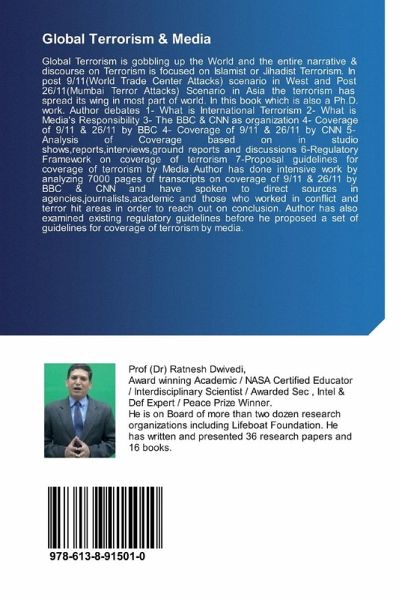 Global Terrorism is gobbling up the World and the entire narrative & discourse on Terrorism is focused on Islamist or Jihadist Terrorism. In post 9/11(World Trade Center Attacks) scenario in West and Post 26/11(Mumbai Terror Attacks) Scenario in Asia the terrorism has spread its wing in most part of world. In this book which is also a Ph.D. work. Author debates 1- What is International Terrorism 2- What is Media's Responsibility 3- The BBC & CNN as organization 4- Coverage of 9/11 & 26/11 by BBC 4- Coverage of 9/11 & 26/11 by CNN 5- Analysis of Coverage based on in studio shows,reports,interviews,ground reports and discussions 6-Regulatory Framework on coverage of terrorism 7-Proposal guidelines for coverage of terrorism by Media Author has done intensive work by analyzing 7000 pages of transcripts on coverage of 9/11 & 26/11 by BBC & CNN and have spoken to direct sources in agencies,journalists,academic and those who worked in conflict and terror hit areas in order to reach out on conclusion. Author has also examined existing regulatory guidelines before he proposed a set of guidelines for coverage of terrorism by media.
