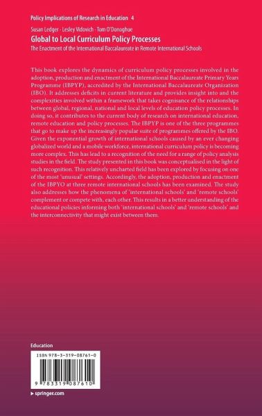 This book explores the dynamics of curriculum policy processes involved in the adoption, production and enactment of the International Baccalaureate Primary Years Programme (IBPYP), accredited by the International Baccalaureate Organization (IBO). It addresses deficits in current literature and provides insight into and the complexities involved within a framework that takes cognisance of the relationships between global, regional, national and local levels of education policy processes. In doing so, it contributes to the current body of research on international education, remote education and policy processes. The IBPYP is one of the three programmes that go to make up the increasingly popular suite of programmes offered by the IBO. Given the exponential growth of international schools caused by an ever changing globalized world and a mobile workforce, international curriculum policy is becoming more complex. This has lead to a recognition of the need for a range of policy analysis studies in the field. The study presented in this book was conceptualised in the light of such recognition. This relatively uncharted field has been explored by focusing on one of the most 'unusual' settings. Accordingly, the adoption, production and enactment of the IBPYO at three remote international schools has been examined. The study also addresses how the phenomena of 'international schools' and 'remote schools' complement or compete with, each other. This results in a better understanding of the educational policies informing both 'international schools' and 'remote schools' and the interconnectivity that might exist between them.