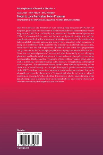 This book explores the dynamics of curriculum policy processes involved in the adoption, production and enactment of the International Baccalaureate Primary Years Programme (IBPYP), accredited by the International Baccalaureate Organization (IBO). It addresses deficits in current literature and provides insight into and the complexities involved within a framework that takes cognisance of the relationships between global, regional, national and local levels of education policy processes. In doing so, it contributes to the current body of research on international education, remote education and policy processes. The IBPYP is one of the three programmes that go to make up the increasingly popular suite of programmes offered by the IBO. Given the exponential growth of international schools caused by an ever changing globalized world and a mobile workforce, international curriculum policy is becoming more complex. This has lead to a recognition of the need for a range of policy analysis studies in the field. The study presented in this book was conceptualised in the light of such recognition. This relatively uncharted field has been explored by focusing on one of the most 'unusual' settings. Accordingly, the adoption, production and enactment of the IBPYO at three remote international schools has been examined. The study also addresses how the phenomena of 'international schools' and 'remote schools' complement or compete with, each other. This results in a better understanding of the educational policies informing both 'international schools' and 'remote schools' and the interconnectivity that might exist between them.