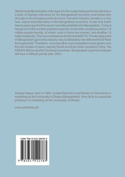 Global trade liberalization with regard to the readymade garments industry is a topic of highest relevance for the Bangladeshi economy and linked very strongly to its changing social structure. Garment industry actually is a very new, export-oriented sector of the Bangladesh economy. It was only some twenty years ago that this sector was fully established in Bangladesh. Today it has grown to the number eighteen exporter world-wide, employing some 1.8 million people directly, of whom most of them are women, and another 10 million indirectly. The main markets are the EU and NAFTA. The development of Bangladesh garments industry was facilitated by the different Multi Fibre Arrangements. Therefore - as many other new competitors have grown over the last couple of years, namely South and East Asian including China, the ASEAN, Mexico and 24 Caribbean countries - Bangladesh's garment industry will face a difficult period after 2004.