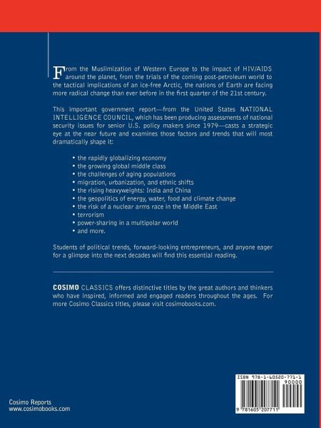 From the Muslimization of Western Europe to the impact of HIV/AIDS around the planet, from the trials of the coming post-petroleum world to the tactical implications of an ice-free Arctic, the nations of Earth are facing more radical change than ever before in the first quarter of the 21st century. This important government report-from the United States NATIONAL INTELLIGENCE COUNCIL, which has been producing assessments of national security issues for senior U.S. policy makers since 1979-casts a strategic eye at the near future and examines those factors and trends that will most dramatically shape it: ¿ the rapidly globalizing economy ¿ the growing global middle class ¿ the challenges of aging populations ¿ migration, urbanization, and ethnic shifts ¿ the rising heavyweights: India and China ¿ the geopolitics of energy, water, food and climate change ¿ the risk of a nuclear arms race in the Middle East ¿ terrorism ¿ power-sharing in a multipolar world ¿ and more. Students of political trends, forward-looking entrepreneurs, and anyone eager for a glimpse into the next decades will find this essential reading.