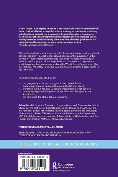 List of Illustrations Acknowledgements List of Contributors Part I. International Political Economy and Organized Labour: Approaches and Theories Chapter 1. Introduction: Organized Labour and Global Political Economy Chapter 2. Work, Production and Social Relations: Repositioning the Firm in the International Political Economy Chapter 3. Towards an International Political Economy of Labour Chapter 4. Internationalization, Industrial Relations and International Relations Part II. National and Regional Strategies Chapter 5. Organizing Globally, Organizing Local: Geographical Scale and Union Spatial Strategy Chapter 6. Trade Unions, Training and Globalization: Initiatives in Britain and Brazil Chapter 7. The International Dimension of Labour Federation Economic Strategy in Canada and the United States 1947 - 2000 Chapter 8. Unions, States and Capitals: Competing (Inter)nationalisms in North America and European Integration Chapter 9. International Labour and Regional Integration: Asia-Pacific Part III. The Global Arena: Unions and Global Dynamics Chapter 10. The Constraints on Labour Internationalism: Contradictions and Prospects Chapter 11. Labour Movement Renewal in the Era of Globalization: Union Responses in the South Chapter 12. Peripheralizing Labour: the ILO, WTO and the Completion of the Bretton Woods Project Chapter 13. The Varied Paths to Minimum Global Labour Standads Chapter 14. Labour as a Global Social Force: Past Divisions and New Tasks References Index