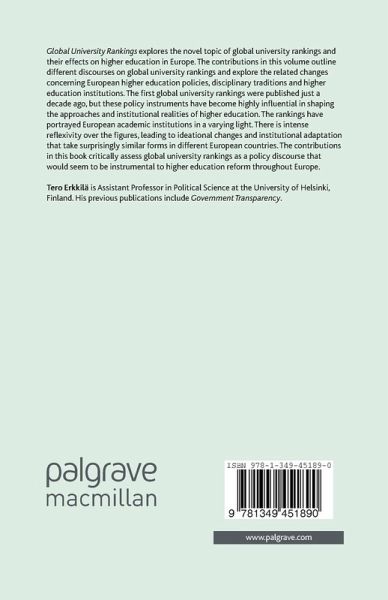 Preface PART I: GLOBAL UNIVERSITY RANKINGS: HISTORY, CONCEPTS AND INTERNATIONAL DEVELOPMENTS 1. Introduction; Tero Erkkilä 2. The Impact of Rankings on the European Higher Education Landscape; Barbara M. Kehm 3. Global, Asian and European Backgrounds of Global University Rankings; Bob Reinalda PART II: UNIVERSITY RANKINGS AND INSTITUTIONAL COMPETITION: COMMODIFICATION, STRATIFICATION AND UNIFORMITY 4. Convergence and Divergence in Research, Higher Education and Innovation Policies; Antti Pelkonen and Tuula Teräväinen 5. Buffer, Filter or Channel? Åse Gornitzka 6. The Drift to Conformity; Jon Nixon 7. Polish Higher Education and the Global Academic Competition; Dorota Dakowska 8. Reforming Higher Education Institutions in Finland; Tero Erkkilä and Ossi Piirone PART III: UNIVERSITY RANKINGS AND DISCIPLINARITY: CHALLENGES FOR SOCIAL SCIENCES AND HUMANITIES 9. Measuring Excellence in Social Sciences and Humanities; Arto Mustajoki 10. Ranking European Social Science and Stratifying Global Knowledge; Niilo Kauppi 11. Global Disciplinary Rankings and Images of Quality; Erkki Berndtson 12. The Colonization of the Academic Field by Rankings; Richard Münch PART IV: CONCLUSIONS 13. Global Rankings as a Marker of Revaluing the University; James H. Mittelman 14. Conclusions; Tero Erkkilä Index