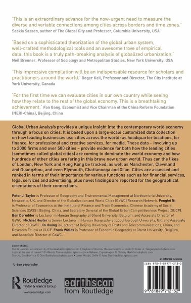 Global Urban Analysis provides a unique insight into the contemporary world economy through a focus on cities. It is based upon a large-scale customised data collection on how leading businesses use cities across the world: as headquarter locations, for finance, for professional and creative services, for media. These data - involving up to 2000 firms and over 500 cities - provide evidence for both how the leading cities, sometimes called global cities, are coming to dominate the world economy, and how hundreds of other cities are faring in this brave new urban world. Thus can the likes of London, New York and Hong Kong be tracked as well as Manchester, Cleveland and Guangzhou, and even Plymouth, Chattanooga and Xi'an. Cities are assessed and ranked in terms of their importance for various functions such as for financial services, legal services and advertising, plus novel findings are reported for the geographical orientations of their connections. This is truly a comprehensive survey of cities in globalization covering global, world-regional, and national scales of analysis: - 4 key chapters outline the global structure of the world economy featuring the leading cities; - 9 regional chapters covering the whole world also feature the level of services provided by 'medium' cities; - 22 chapters on selected countries and sub-regions indicate global-ness and local-ness and feature an even wider range of cities. Written in an easy to understand style, this book is a must read for anybody interested in their own city in the world and how it relates to other cities.