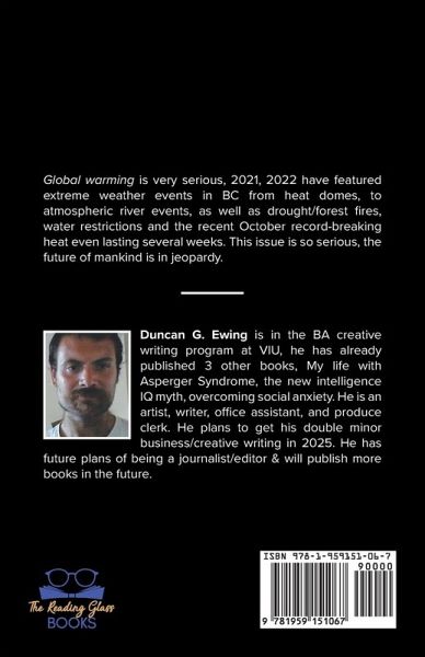Global warming is very serious, 2021, 2022 have featured extreme weather events, as well as drought/forest fires, water restrictions and the recent October record-breaking heat even lasting several weeks. The issue is so serious, the future of mankind is in jeopardy. Duncan G. Ewing is in the BA creative writing program at VIU, he has already published 3 other books, My life with Asperger Syndrome, the new intelligence IQ myth, overcoming social anxiety. He is an artist, writer office assistant, and produce clerk. He plans to get his double minor business/ creative writing in 2025. He has future plans of being a journalist/ editor & will publish more books in the future.