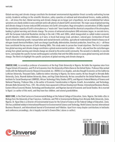 Global warming and climate change constitute the dominant environmental degradation threat currently confronting human society. Academic writings in the scientific literature, policy speeches at national and international forums, media publicity, etc.all stress this fact: Global warming and climate change are no longer just a hypothesis, but an established fact whose symptoms are clearly visible in every continent and in all spheres of planet Earths environment. The major cause of global warming and climate change is human-induced GHG emissions into Earths atmosphere. Huge atmospheric concentrations of GHGs beyond the assimilation capacity of Earths atmosphere as a waste sink have transformed the chemical composition of the atmosphere, leading to global warming and climate change. The process of enhanced atmospheric GHG emissions began, in concrete terms, with the European Industrial Revolution starting in the mid-1700s and 1800s, which inaugurated so-called modern economic growth (Kuznets 1966), whose lifeblood, as it were, is fossil-fuel energy (coal, petroleum, natural gas). Combustion of fossil fuels to drive industrial growth, transportation and myriad domestic activities, agricultural modernization linked to heavy use of nitrogen-based chemical fertilizers, land-use change (specifically, deforestation, livestock production, forest fires, etc.)all these have constituted the key sources of Earth-heating GHGs. This study seeks to pursue four broad objectives. The first is to explain how global warming and climate change constitutes a global environmental problemthat is, why and how the costs/damages arising from global warming and climate change are shared by the entire world community. The second is to identify, in concrete terms, and explain the specific human (anthropogenic) activities that emit the GHGs known to cause global warming and climate change. The third is to highlight the specific symptoms of global warming and climate change in.