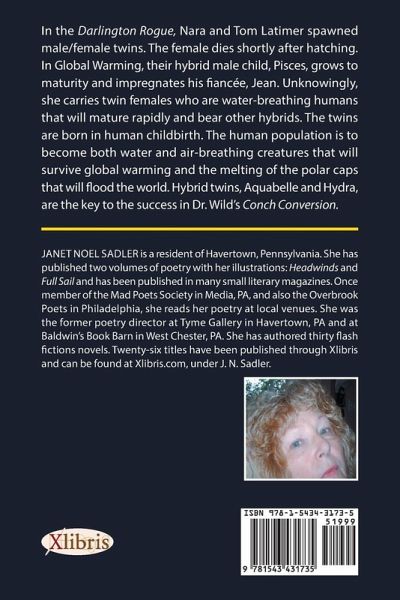 In the Darlington Rogue, Nara and Tom Latimer spawned male/female twins. The female dies shortly after hatching. In Global Warming, their hybrid male child, Pisces, grows to maturity and impregnates his fi ancée, Jean. Unknowingly, she carries twin females who are water-breathing humans that will mature rapidly and bear other hybrids. The twins are born in human childbirth. The human population is to become both water and air-breathing creatures that will survive global warming and the melting of the polar caps that will fl ood the world. Hybrid twins, Seabelle and Hydra, are the key to the success in Dr. Wild’s Conch Conversion.