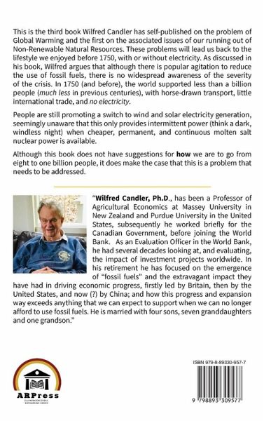 This is the third book Wilfred Candler has self-published on the problem of Global Warming and the first on the associated issues of our running out of Non-Renewable Natural Resources. These problems will lead us back to the lifestyle we enjoyed before 1750, with or without electricity. As discussed in his book, Wilfred argues that although there is popular agitation to reduce the use of fossil fuels, there is no widespread awareness of the severity of the crisis. In 1750 (and before), the world supported less than a billion people (much less in previous centuries), with horse-drawn transport, little international trade, and no electricity. People are still promoting a switch to wind and solar electricity generation, seemingly unaware that this only provides intermittent power (think a dark, windless night) when cheaper, permanent, and continuous molten salt nuclear power is available. Although this book does not have suggestions for how we are to go from eight to one billion people, it does make the case that this is a problem that needs to be addressed.