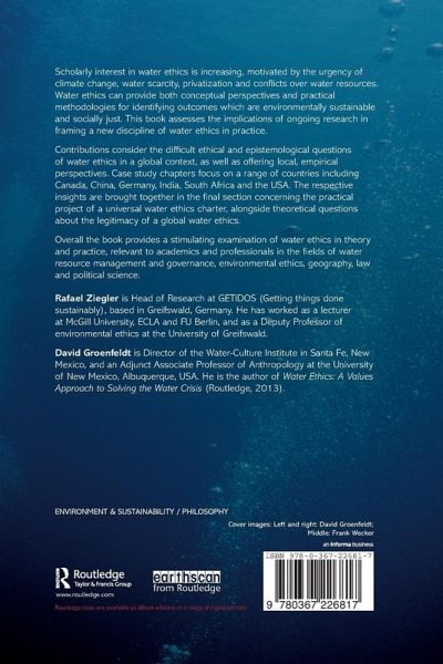 Rafael Ziegler is Head of Research at GETIDOS (Getting things done sustainably), based in Greifswald, Germany. He has worked as a lecturer at McGill University, ECLA and FU Berlin, and as a Deputy Professor of environmental ethics at the University of Greifswald. David Groenfeldt is Director of the Water-Culture Institute in Santa Fe, New Mexico, and an Adjunct Associate Professor of Anthropology at the University of New Mexico, Albuquerque, USA. He is the author of Water Ethics: A Values Approach to Solving the Water Crisis (Routledge, 2013).