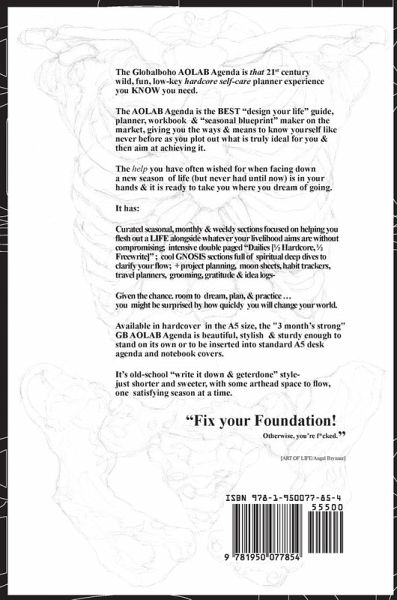 The Globalboho AOLAB Agenda is that 21st century wild, fun, low-key hardcore self-care planner experience you KNOW you need. The AOLAB Agenda is the BEST "design your life" guide, planner, workbook & "seasonal blueprint" maker on the market, giving you the ways & means to know yourself like never before as you plot out what is truly ideal for you & then aim at achieving it. The help you have often wished for when facing down a new season of life (but never had until now) is in your hands & it is ready to take you where you dream of going. It has: Curated seasonal, monthly & weekly sections focused on helping you flesh out a LIFE alongside whatever your livelihood aims are without compromising; intensive double paged "Dailies [¿ Hardcore, ¿ Freewrite]" ; cool GNOSIS sections full of spiritual deep dives to clarify your flow; + project planning, moon sheets, habit trackers, travel planners, grooming, gratitude & idea logs- Given the chance, room to dream, plan, & practice~you might be surprised by how quickly you will change your world. Available in hardcover in the A5 size, the "3 month's strong" GB AOLAB Agenda is beautiful, stylish & sturdy enough to stand on its own or to be inserted into some A5 desk agenda and notebook covers. It's old-school "write it down & geterdone" style- just shorter and sweeter, with some arthead space to flow, one satisfying season at a time. "Fix your Foundation! Otherwise, you're f*cked." [AOLAB: ART OF LIFE/Angel Brynner]