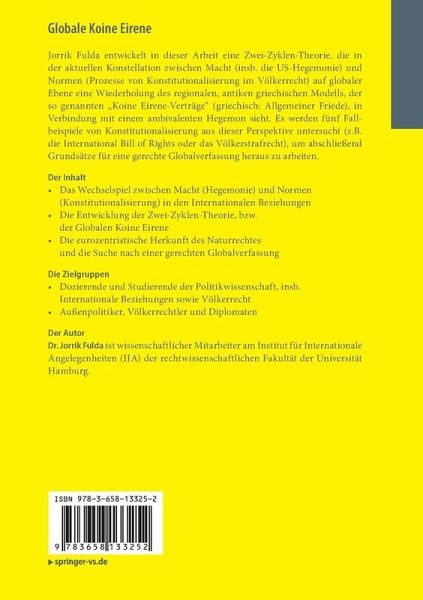 Jorrik Fulda entwickelt in dieser Arbeit eine Zwei-Zyklen-Theorie,die in der aktuellen Konstellation zwischenMacht (insb. die US-Hegemonie) und Normen (Prozesse von Konstitutionalisierungim Völkerrecht) auf globaler Ebene eine Wiederholung des regionalen, antikengriechischen Modells, der so genannten "Koine Eirene-Verträge" (griechisch:Allgemeiner Friede), in Verbindung mit einem ambivalenten Hegemon sieht. Eswerden fünf Fallbeispiele von Konstitutionalisierung aus dieser Perspektiveuntersucht (z.B. die International Bill of Rights oder das Völkerstrafrecht),um abschließend Grundsätze für eine gerechte Globalverfassung heraus zuarbeiten.