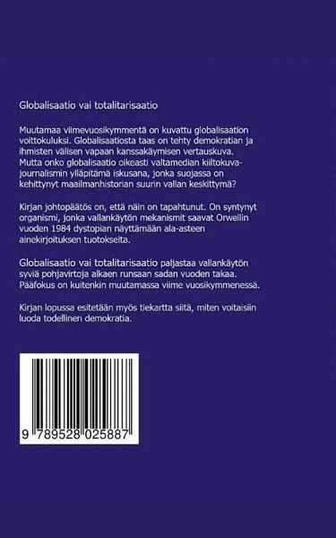 Läntisten sivistysmaiden johtajat rehentelevät tavan takaa demokratiallaan heristäen samalla sormeaan milloin millekin maalle, jonka demokratiassa on heidän mielestä puutteita. Mutta mikä on länsimaiden oman demokratian laita? Onko sitä? Kirja tarkastelee maailman johtavien suurvaltojen politiikan syviä pohjavirtoja alkaen runsaan sadan vuoden takaa. Tarkastelun pääfokus on kuitenkin muutaman viime vuosikymmenen tapahtumissa. Tarkastelun lopputulema on, että on syntynyt lähes koko maailman kattava totalitaarinen valtarakenne. Sen kaltaista ei vastaavassa laajuudessa ole aiemmin tunnettu maailmanhistoriassa. Valtarakenteen on mahdollistanut valtavien pääomakeskittymien synty liittyneenä sotilaalliseen varustautumiseen. Samalla luodun järjestelmän vallankäytön mekanismit ovat niin niin taitavasti rakennetut, että länsimaiden väestöjen enemmistöillä ei ole vähäisintäkään ymmärrystä luodun järjestelmän todellisesta luonteesta. Tämä maailma sisältää monia sekä Orwellin vuoden 1984, kuten esimerkiksi jatkuvat sodat, että myös Aldous Huxleyn visioita kuten vallankäytön pehmeät metodit fyysisen rankaisun sijaan.