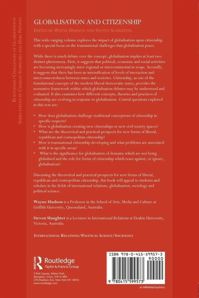 This wide-ranging volume explores the impact of globalization upon citizenship, with a special focus on the transnational challenges that globalization poses. While there is much debate over the concept, globalization implies at least two distinct phenomena. First, it suggests that political, economic and social activities are becoming increasingly inter-regional or intercontinental in scope. Secondly, it suggests that there has been an intensification of levels of interaction and interconnectedness between states and societies. Citizenship, as one of the foundational concepts of the modern liberal democratic states, provides the normative framework within which globalization debates may be understood and evaluated. It also examines how different concepts, theories and practices of citizenship are evolving in response to globalization. Central questions explored in this text are: ¿ How does globalization challenge traditional conceptions of citizenship in specific respects? ¿ How is globalization creating new citizenships or new civil society spaces? ¿ How is transnational citizenship developing and what problems are associated with it in specific areas? Discussing the theoretical and practical prospects for new forms of liberal, republican and cosmopolitan citizenship, Globalisation and Citizenship will appeal to students and scholars in the fields of international relations, globalization, sociology and political science.