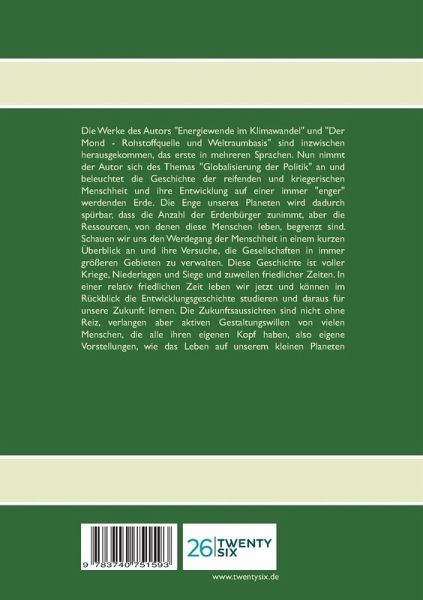 Die Werke des Autors "Energiewende im Klimawandel" und "Der Mond - Rohstoffquelle und Weltraumbasis" sind inzwischen herausgekommen, das erste in mehreren Sprachen. Nun nimmt der Autor sich des Themas "Globalisierung der Politik" an und beleuchtet die Geschichte der reifenden und kriegerischen Menschheit und ihre Entwicklung auf einer immer "enger" werdenden Erde. Die Enge unseres Planeten wird dadurch spürbar, dass die Anzahl der Erdenbürger zunimmt, aber die Ressourcen, von denen diese Menschen leben, begrenzt sind. Schauen wir uns den Werdegang der Menschheit in einem kurzen Überblick an und ihre Versuche, die Gesellschaften in immer größeren Gebieten zu verwalten. Diese Geschichte ist voller Kriege, Niederlagen und Siege und zuweilen friedlicher Zeiten. In einer relativ friedlichen Zeit leben wir jetzt und können im Rückblick die Entwicklungsgeschichte studieren und daraus für unsere Zukunft lernen. Die Zukunftsaussichten sind nicht ohne Reiz, verlangen aber aktiven Gestaltungswillen von vielen Menschen, die alle ihren eigenen Kopf haben, also eigene Vorstellungen, wie das Leben auf unserem kleinen Planeten weitergehen soll.