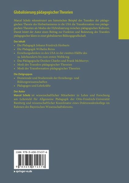 Marcel Scholz rekonstruiert am historischen Beispiel des Transfers der pädagogischen Theorie des Herbartianismus in die USA die Transformation von pädagogischen Theorien als Modus der Hybridisierung zwischen pädagogischen Kulturen. Damit leistet der Autor einen Beitrag zur Funktion und Bedeutung des Transfers pädagogischer Ideen in einer globalisierten Bildungsgesellschaft.