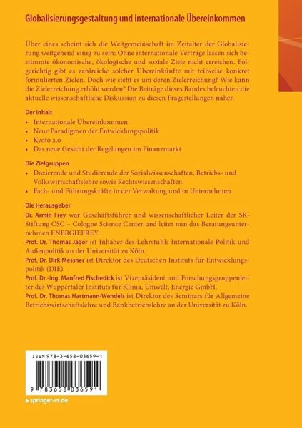 Dr. Armin Frey war Geschäftsführer und wissenschaftlicher Leiter der SK-Stiftung CSC - Cologne Science Center und leitet nun das Beratungsunternehmen ENERGIEFREY. Prof. Dr. Thomas Jäger ist Inhaber des Lehrstuhls Internationale Politik und Außenpolitik an der Universität zu Köln. Prof. Dr. Dirk Messner ist Direktor des Deutschen Instituts für Entwicklungspolitik (DIE). Prof. Dr.-Ing. Manfred Fischedick ist Vizepräsident und Forschungsgruppenleiter des Wuppertaler Instituts für Klima, Umwelt, Energie GmbH. Prof. Dr. Thomas Hartmann-Wendels ist Direktor des Seminars für Allgemeine Betriebswirtschaftslehre und Bankbetriebslehre an der Universität zu Köln.