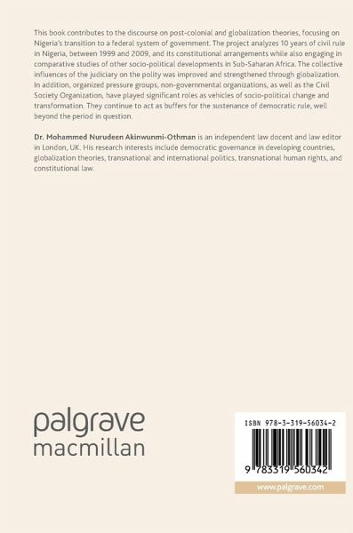 This book contributes to the discourse on post-colonial and globalization theories, focusing on Nigeria's transition to a federal system of government. The project analyzes 10 years of civil rule in Nigeria, between 1999 and 2009, and its constitutional arrangements while also engaging in comparative studies of other socio-political developments in Sub-Saharan Africa. The collective influences of the judiciary on the polity was improved and strengthened through globalization. In addition, organized pressure groups, non-governmental organizations, as well as the Civil Society Organization, have played significant roles as vehicles of socio-political change and transformation. They continue to act as buffers for the sustenance of democratic rule, well beyond the period in question.