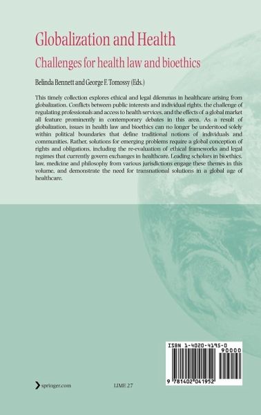 Within contemporary society, globalization has emerged as a key concern at the centre of ethical, legal and policy debates relating to health care. Conflicts between public interests and individual rights, the challenge of regulating health professionals and access to health services, and the effects of a global market all feature prominently in these discussions. As a result of globalization, these issues can no longer be understood solely within the political boundaries that define traditional notions of individuals and communities. Rather, solutions demand a global conception of rights and obligations, which in turn requires new approaches to health policy formulation and a reevaluation of existing ethical and legal frameworks. In essence, the impact of globalization on human health is testing the robustness of modern regulatory systems, legal doctrines and ethical paradigms. PUBLIC HEALTH: DEVELOPING GLOBAL CONCERNS The interconnectedness of the global economy presents new challenges in public health. While globalization has facilitated improvements in health care, it has also created new hazards and avenues for the exploitation of vulnerable persons. It is becoming increasingly apparent that both national and international responses are required. Indeed, as the chapters in this section convey, public health is rightly a global concern. Globalization has led to a sharing of both risks and responsibilities in public health. Belinda Bennett reminds us of the ease with which infectious diseases can spread within the global community, given the speed of modern travel and trade.