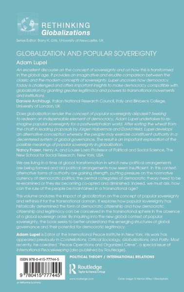 We are living in a time of global transformation in which new political arrangements are being formed and old political arrangements now seem insufficient. In this context, alternative forms of authority are gaining strength, putting pressure on the normative currency of democratic politics; the central categories of democratic theory need to be re-examined or they risk becoming co-opted and diminished. Indeed, we must ask, how can the rule of the people be maintained in a transnational age? This volume analyzes the impact of globalization on the concept of popular sovereignty and rethinks it for the transnational domain. It explores how popular sovereignty has historically determined the form of democratic citizenship and how democratic citizenship and legitimacy can be conceived in the transnational sphere in the absence of a global sovereign order. By inquiring into the new global context of popular sovereignty, the book seeks to better understand the emerging structures of global governance and their potential for democratic legitimacy. Lupel argues: That the challenges of globalization necessitate a rethinking of the concept of popular sovereignty beyond the domain of the nation-state That such a rethinking reveals a tension between the particularism of democratic legitimacy and the universalism of cosmopolitan politics Thus critical attention to the constitutive processes of global governance must become an integral part of democratic theory in the context of globalization; and a principle of transnational popular sovereignty provides the best resources for this purpose. This book will be of interest to students and scholars of globalization, democratic theory and international relations theory.