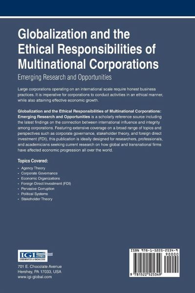 Large corporations operating on an international scale require honest business practices. It is imperative for corporations to conduct activities in an ethical manner, while also attaining effective economic growth. Globalization and the Ethical Responsibilities of Multinational Corporations: Emerging Research and Opportunities is a scholarly reference source including the latest findings on the connection between international influence and integrity among corporations. Featuring extensive coverage on a broad range of topics and perspectives such as corporate governance, stakeholder theory, and foreign direct investment (FDI), this publication is ideally designed for researchers, professionals, and academicians seeking current research on how global and transnational firms have affected economic progression all over the world.