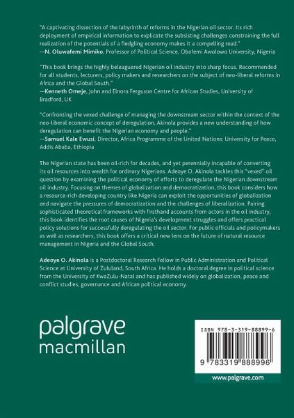 The Nigerian state has been oil-rich for decades, and yet perennially incapable of converting its oil resources into wealth for ordinary Nigerians. Adeoye O. Akinola tackles this "vexed" oil question by examining the political economy of efforts to deregulate the Nigerian downstream oil industry. Focusing on themes of globalization and democratization, this book considers how a resource-rich developing country like Nigeria can exploit the opportunities of globalization and navigate the pressures of democratization and the challenges of liberalization. Pairing sophisticated theoretical frameworks with firsthand accounts from actors in the oil industry, this book identifies the root causes of Nigeria's development struggles and offers practical policy solutions for successfully deregulating the oil sector. For public officials and policymakers as well as researchers, this book offers a critical new lens on the future of natural resource management in Nigeria and the Global South.