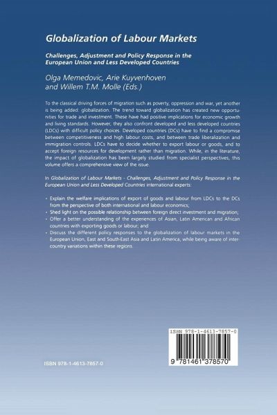 To the classical driving forces of migration such as poverty, oppression and war, yet another is being added: globalization. With the increasing economic interdependence between countries migration has become one of the important links. Many less developed countries (LDCs) accept migration of their workers to developed countries (DCs) because it reduces the pressure on unemployment, and remittances increase the capital inflow to the country. On the other hand, some of the DCs see migration as a threat to their employment and system of social security. Participants of the Second Annual Workshop of the Network EU-LDC Trade and Capital Relations gave a broad view of the problem which both DCs and LDCs are facing in connection with the globalization of labour markets. This volume consists of 10 chapters by scholars from the European Union (EU) and LDCs. Each paper is discussed in terms of its policy relevance by a policy maker as well as by an academic specializing in the field. In the opening chapter we aim to do justice to the discussion during the Workshop in Rotterdam in May 1995 at which preliminary versions of all chapters were presented. Edited versions of the interven tions by the policy makers and experts are included as far as possible af ter the chapters. The opinions expressed in this volume are those of the authors and not necessarily those of their organizations.