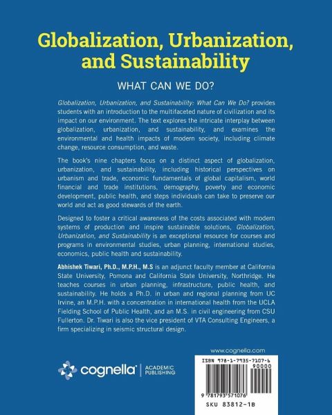 Globalization, Urbanization, and Sustainability: What Can We Do? provides students with an introduction to the multifaceted nature of civilization and its impact on our environment. The text explores the intricate interplay between globalization, urbanization, and sustainability, and examines the environmental and health impacts of modern society, including climate change, resource consumption, and waste. The book's nine chapters focus on a distinct aspect of globalization, urbanization, and sustainability, including historical perspectives on urbanism and trade, economic fundamentals of global capitalism, world financial and trade institutions, demography, poverty and economic development, public health, and steps individuals can take to preserve our world and act as good stewards of the earth. Designed to foster a critical awareness of the costs associated with modern systems of production and inspire sustainable solutions, Globalization, Urbanization, and Sustainability is an exceptional resource for courses and programs in environmental studies, urban planning, international studies, economics, public health and sustainability.
