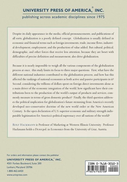 This study focuses on three major questions in an effort to define and measure cultural, political, and demographic forces that drive globalization. First, what have the different national industries contributed to the globalization process, and how has this affected the rankings of passively and actively participating national economies? Second, how significant have the billions of dollars in foreign direct investments been to the world's output of products and services? Finally, what are the political implications of America's most recent neo-conservative doctrine of the new world order or the 'New American Century' on globalization's future?