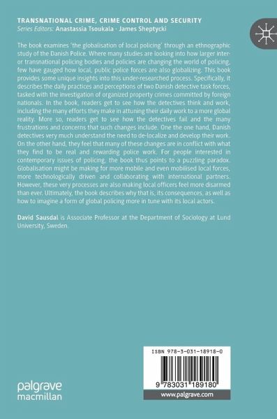 The book examines 'the globalization of local policing' through an ethnographic study of the Danish Police. Where many studies are looking into how larger inter- or transnational policing bodies and policies are changing the world of policing, few have gauged how local, public police forces are also globalizing. This book provides some unique insights into this under-researched process. Specifically, it describes the daily practices and perceptions of two Danish detective task forces, tasked with the investigation of organized property crimes committed by foreign nationals. In the book, readers get to see how the detectives think and work, including the many efforts they make in attuning their daily work to a more global reality. More so, readers get to see how the detectives fail and the many frustrations and concerns that such changes include. One the one hand, Danish detectives very much understand the need to de-localize and develop their work. On the other hand, they feel that many of these changes are in conflict with what they find to be real and rewarding police work. For people interested in contemporary issues of policing, the book thus points to a puzzling paradox. Globalization might be making for more mobile and even mobilised local forces, more technologically driven and collaborating with international partners. However, these very processes are also making local officers feel more disarmed than ever. Ultimately, the book describes why that is, its consequences, as well as how to imagine a form of global policing more in tune with its local actors.
