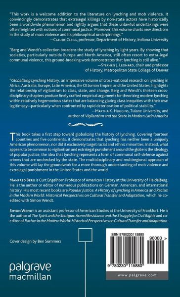 Lynching from an International Perspective; M.Berg & S.Wendt Extralegal Violence and Law in the Early Modern British Isles and the Origins of American Lynching; M.Pfeifer Lynching 'Exceptionalism': The NAACP, Woodrow Wilson, and Keeping Lynching American; C.Waldrep Mexican Perspectives on Mob Violence in the United States; W.Carrigan & C.Webb Lynching and Legitimacy: Toward a Global Description of Mob Murder; R.Thurston Lynching: The Southern African Case; C.Saunders Frontier Justice: Lynching and Racial Violence in the United States and Australia; G.Smithers Ethnic Conflict, the Armenian Question, and Mob Violence in the late Ottoman Empire; E.Aykut Popular justice, Class Conflict, and the Lynching Spirit in France; J.Michel Not Quite Lynching: Informal Justice in Northern Ireland; R.Monaghan Lynching in Peru in the Nineteenth and Early Twentieth Centuries; H.Onken Lynching in Another America: Race, Class, and Gender in Brazil, 1980-2003; T.Clark Vigilantism in Africa: Benin and Beyond; T.Grätz Lynching, Poverty, Witchcraft, and the State in Mozambique; C.Schuetze & C.Jacobs