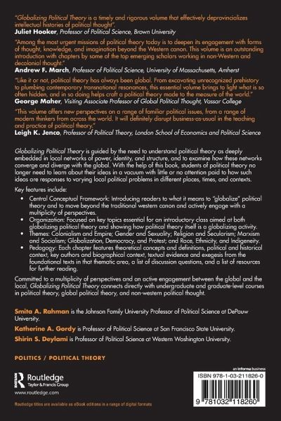 Central Conceptual Framework: Introducing readers to what it means to "globalize" political theory and to move beyond the traditional western canon and actively engage with a multiplicity of perspectives.Organization: Focused on key topics essential for an introductory class aimed at both globalizing political theory and showing how political theory itself is a globalizing activity.Themes: Colonialism and Empire; Gender and Sexuality; Religion and Secularism; Marxism, Socialism, and Globalization; Democracy and Protest; and Race, Ethnicity, and Indigeneity.Pedagogy: Each chapter features theoretical concepts and definitions, political and historical context, key authors and biographical context, textual evidence and exegesis from the foundational texts in that thematic area, a list of discussion questions, and a list of resources for further reading.