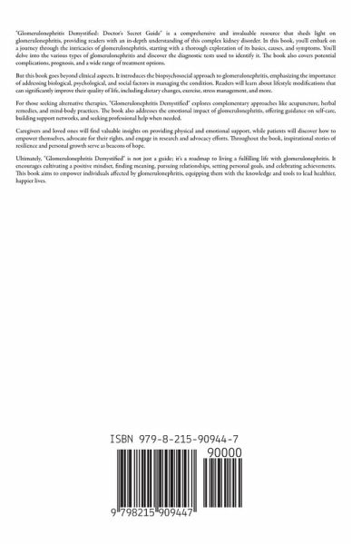 "Glomerulonephritis Demystified: Doctor's Secret Guide" is a comprehensive and invaluable resource that sheds light on glomerulonephritis, providing readers with an in-depth understanding of this complex kidney disorder. In this book, you'll embark on a journey through the intricacies of glomerulonephritis, starting with a thorough exploration of its basics, causes, and symptoms. You'll delve into the various types of glomerulonephritis and discover the diagnostic tests used to identify it. The book also covers potential complications, prognosis, and a wide range of treatment options. But this book goes beyond clinical aspects. It introduces the biopsychosocial approach to glomerulonephritis, emphasizing the importance of addressing biological, psychological, and social factors in managing the condition. Readers will learn about lifestyle modifications that can significantly improve their quality of life, including dietary changes, exercise, stress management, and more. For those seeking alternative therapies, "Glomerulonephritis Demystified" explores complementary approaches like acupuncture, herbal remedies, and mind-body practices. The book also addresses the emotional impact of glomerulonephritis, offering guidance on self-care, building support networks, and seeking professional help when needed. Caregivers and loved ones will find valuable insights on providing physical and emotional support, while patients will discover how to empower themselves, advocate for their rights, and engage in research and advocacy efforts. Throughout the book, inspirational stories of resilience and personal growth serve as beacons of hope. Ultimately, "Glomerulonephritis Demystified" is not just a guide; it's a roadmap to living a fulfilling life with glomerulonephritis. It encourages cultivating a positive mindset, finding meaning, pursuing relationships, setting personal goals, and celebrating achievements. This book aims to empower individuals affected by glomerulonephritis, equipping them with the knowledge and tools to lead healthier, happier lives.