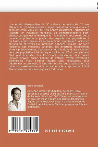 Une étude rétrospective de 50 enfants de moins de 15 ans atteints de glomérulonéphrite aiguë post-streptococcique a été conduite entre 2005 et 2007 au Centre Hospitalier Territorial de Papeete, en Polynésie Française. La glomérulonéphrite post-streptococcique est endémique en Polynésie Francaise et cette population présente la plupart des aspects des populations à haut-risque (bas niveau socio-économique, promiscuité, incidence saisonnière corrélées aux infections cutanées). Malgré une forte incidence des infections cutanées, les infections respiratoires étaient prédominantes. Ceci pourrait être le signe d'une évolution vers une population à faible risque. La fraction C3 du complément était plus abaissée chez les enfants présentant des formes initiales graves. Aucun patient de l'étude n'avait d'évolution défavorable mais d'autres études sont nécessaires pour déterminer le pronostic à long terme dans cette population. La détection systématique et la lutte contre le streptocoque A doit être poursuivie dans ces régions à fort risque.