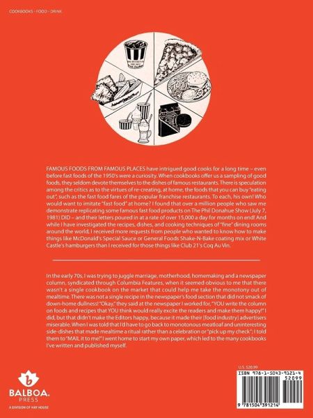 FAMOUS FOODS FROM FAMOUS PLACES have intrigued good cooks for a long time ? even before fast foods of the 1950's were a curiosity. When cookbooks offer us a sampling of good foods, they seldom devote themselves to the dishes of famous restaurants. There is speculation among the critics as to the virtues of re-creating, at home, the foods that you can buy ?eating out?, such as the fast food fares of the popular franchise restaurants. To each, his own! Who would want to imitate ?fast food? at home? I found that over a million people who saw me demonstrate replicating some famous fast food products on The Phil Donahue Show (July 7, 1981) DID ? and their letters poured in at a rate of over 15,000 a day for months on end! And while I have investigated the recipes, dishes, and cooking techniques of ?fine? dining rooms around the world, I received more requests from people who wanted to know how to make things like McDonald's Special Sauce or General Foods Shake-N-Bake coating mix or White Castle's hamburgers than I received for those things like Club 21's Coq Au Vin.