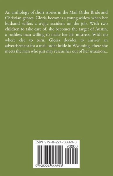 An anthology of short stories in the Mail Order Bride and Christian genres. Gloria becomes a young widow when her husband suffers a tragic accident on the job. With two children to take care of, she becomes the target of Austin, a ruthless man willing to make her his mistress. With no where else to turn, Gloria decides to answer an advertisement for a mail order bride in Wyoming...there she meets the man who just may rescue her out of her situation...